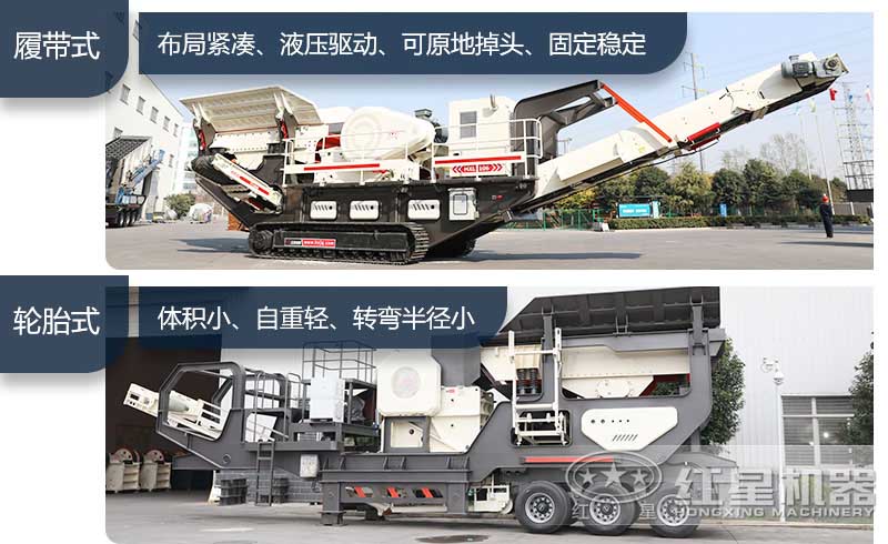 移動(dòng)式軋石機(jī)可分為履帶式移動(dòng)破碎機(jī)和輪胎式移動(dòng)破碎機(jī)兩種形式的驅(qū)動(dòng)方式。